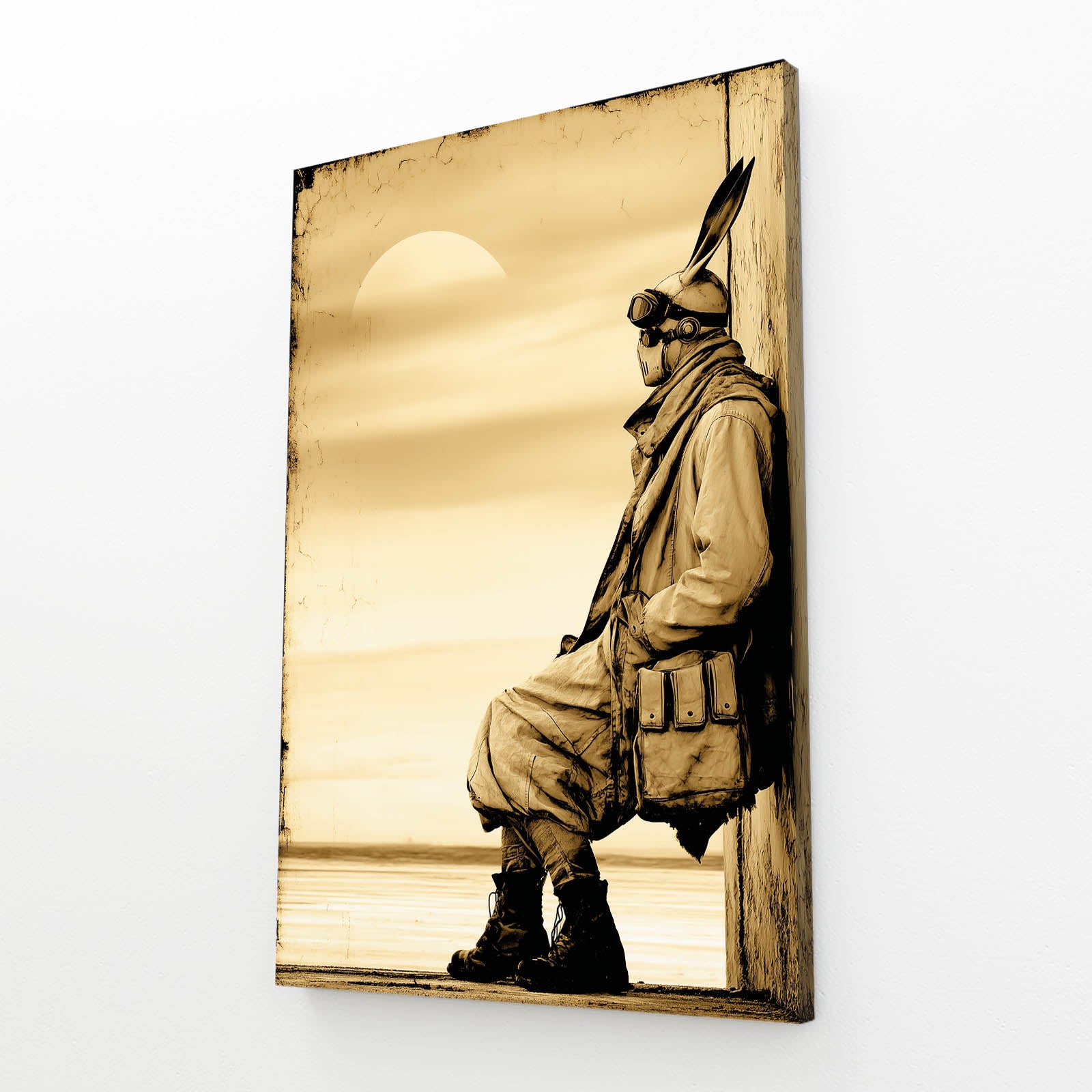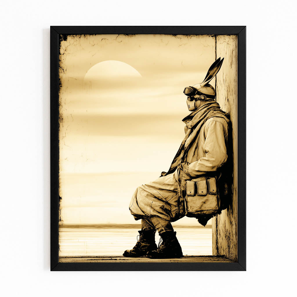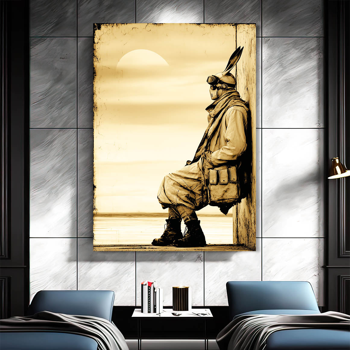 The sepia-toned palette, combined with steampunk details, vintage attire, and mechanical accents, creates a compelling narrative that feels both timeless and imaginative. The lone figure resting against a weathered wall, with tall bunny ears rising from the headgear, evokes mystery, solitude, and visual storytelling. Its peaceful desert horizon adds calm and atmospheric presence to any room.