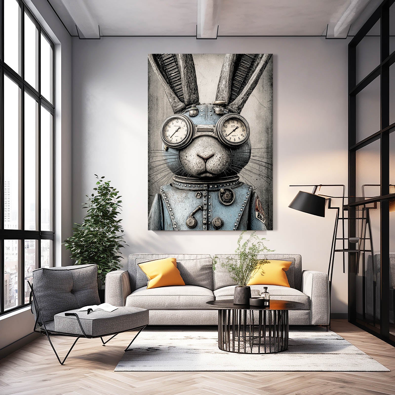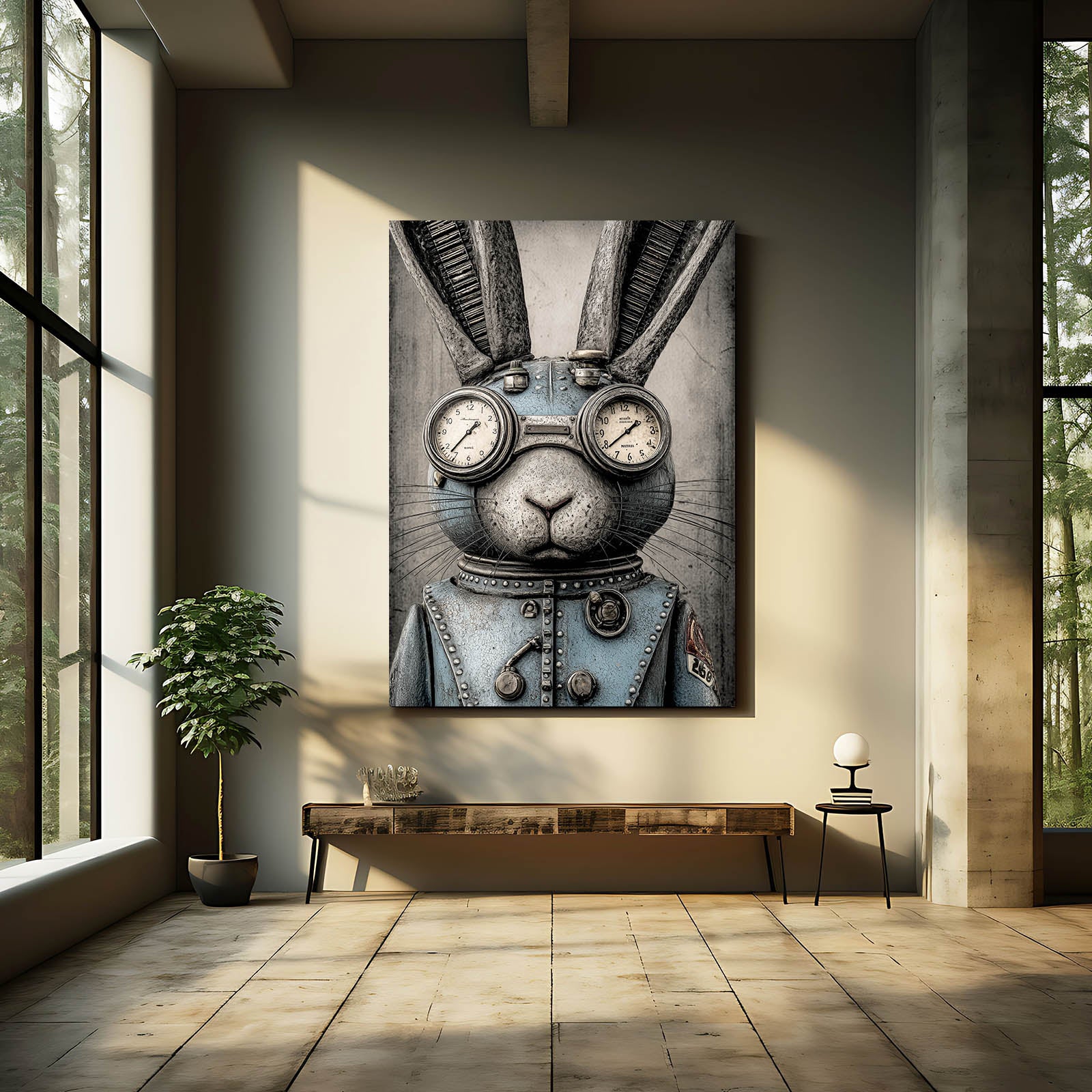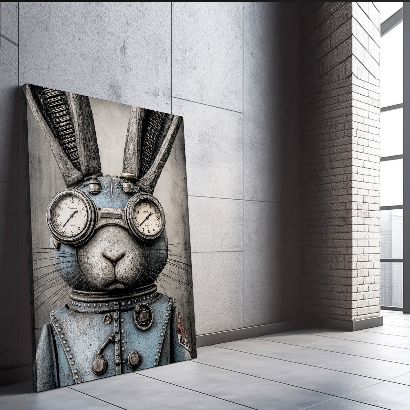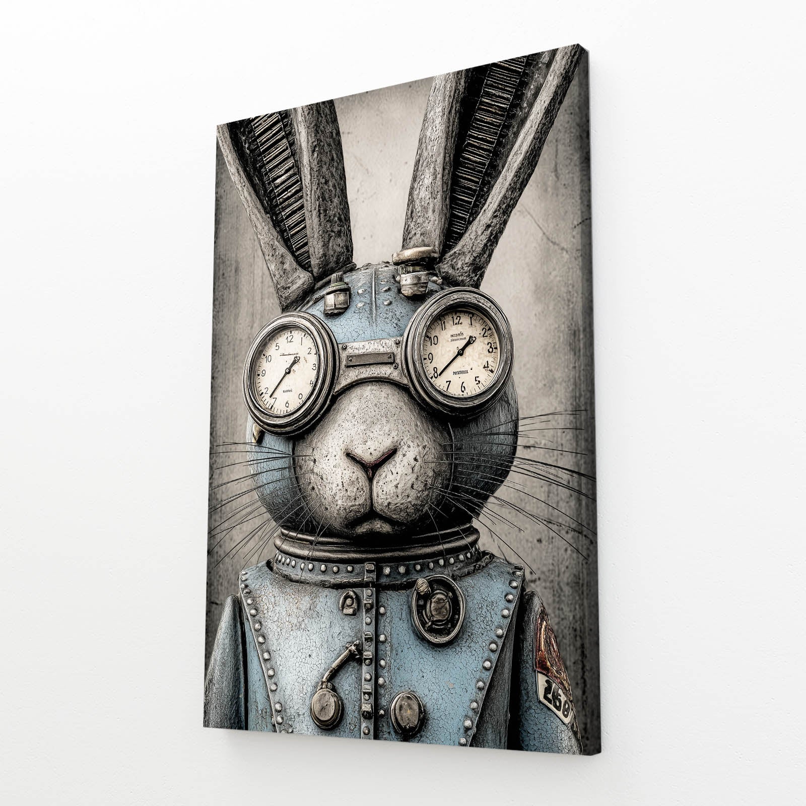 The striking combination of industrial metal tones, antique brass accents, and mechanical goggles creates a captivating steampunk character that feels both bold and refined. The rabbit’s poised expression, complete with dual clock dials and carefully crafted structural pieces, enhances the artwork with precision, mystery, and timeless personality. Its cool blue attire adds visual contrast and depth, making it a standout centerpiece in any room.