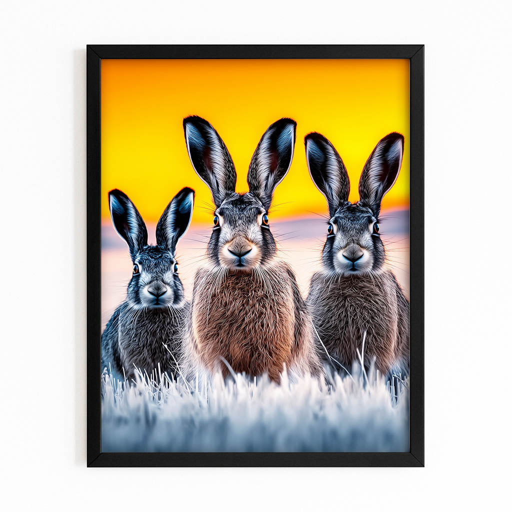 The brilliant mix of sunset orange, soft blues, and gentle purples creates a stunning backdrop that feels both uplifting and serene. The three rabbits, standing attentively side by side, evoke unity, friendship, and wonder, making the composition feel alive and expressive. Their detailed fur and bright eyes add depth, charm, and visual impact to the overall artwork.
