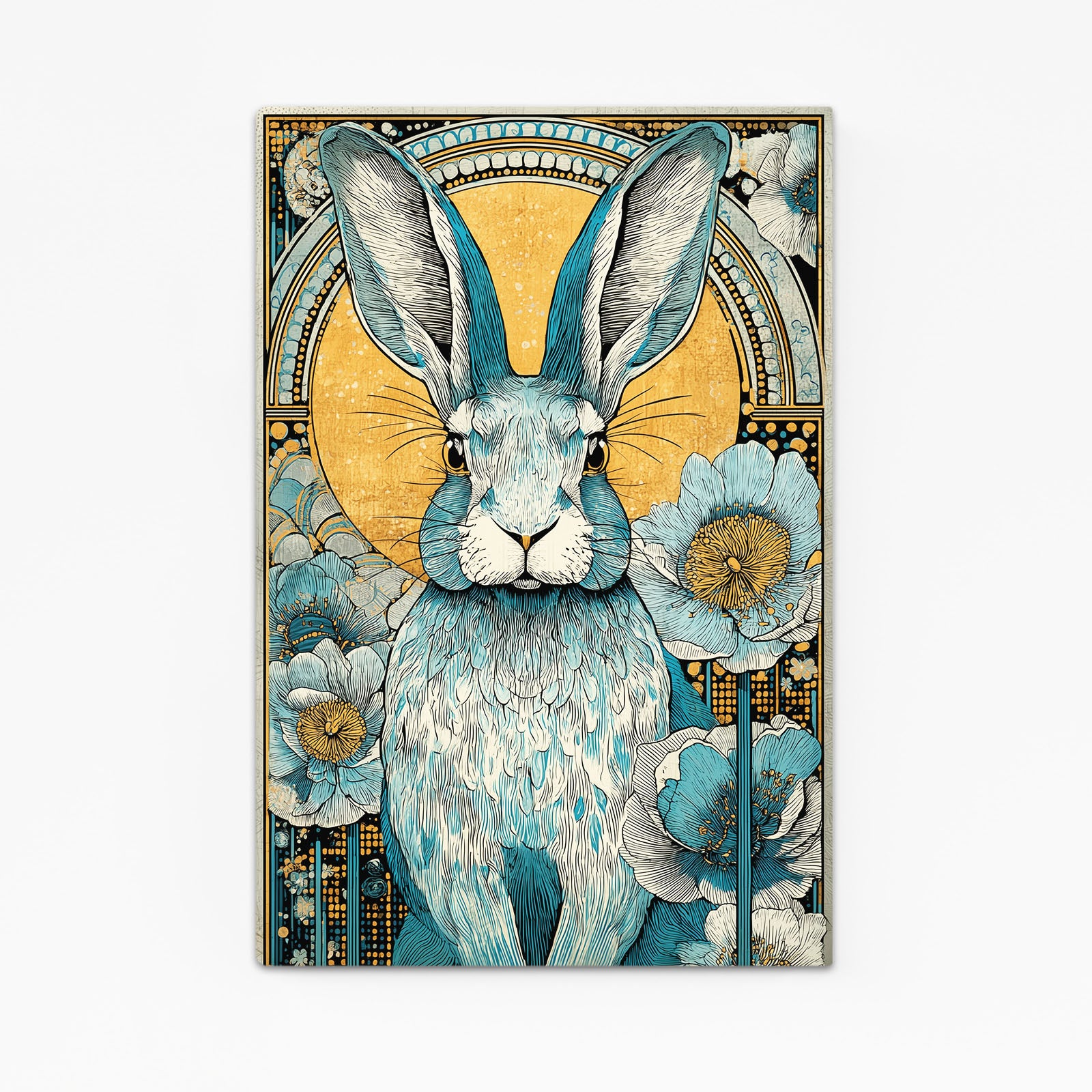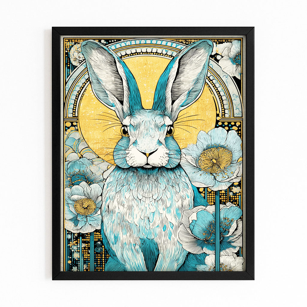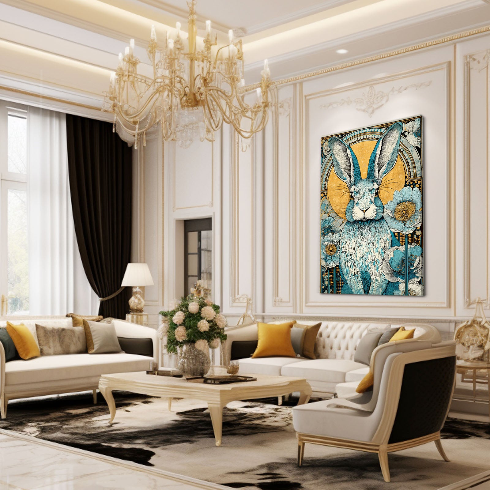 The enchanting mix of turquoise blues, golden accents, and intricate floral elements creates a captivating atmosphere that feels both vibrant and serene. The rabbit’s poised stance, framed by a glowing circular backdrop, adds symbolism, focus, and visual depth to the composition. Every curve, line, and patterned element enhances the artwork’s artistic richness, making it a true statement piece.