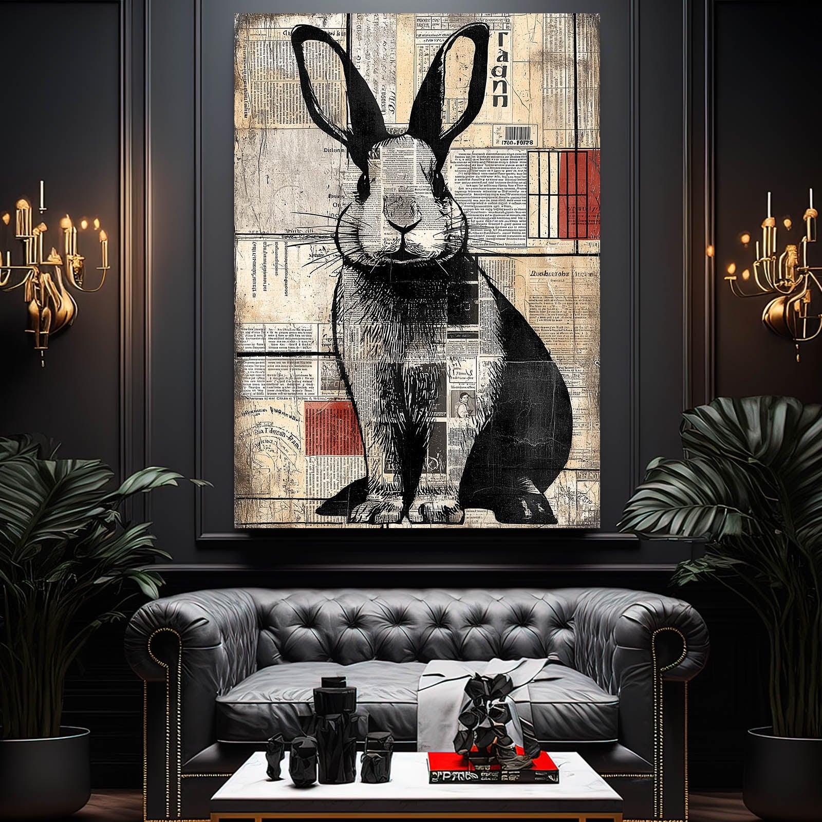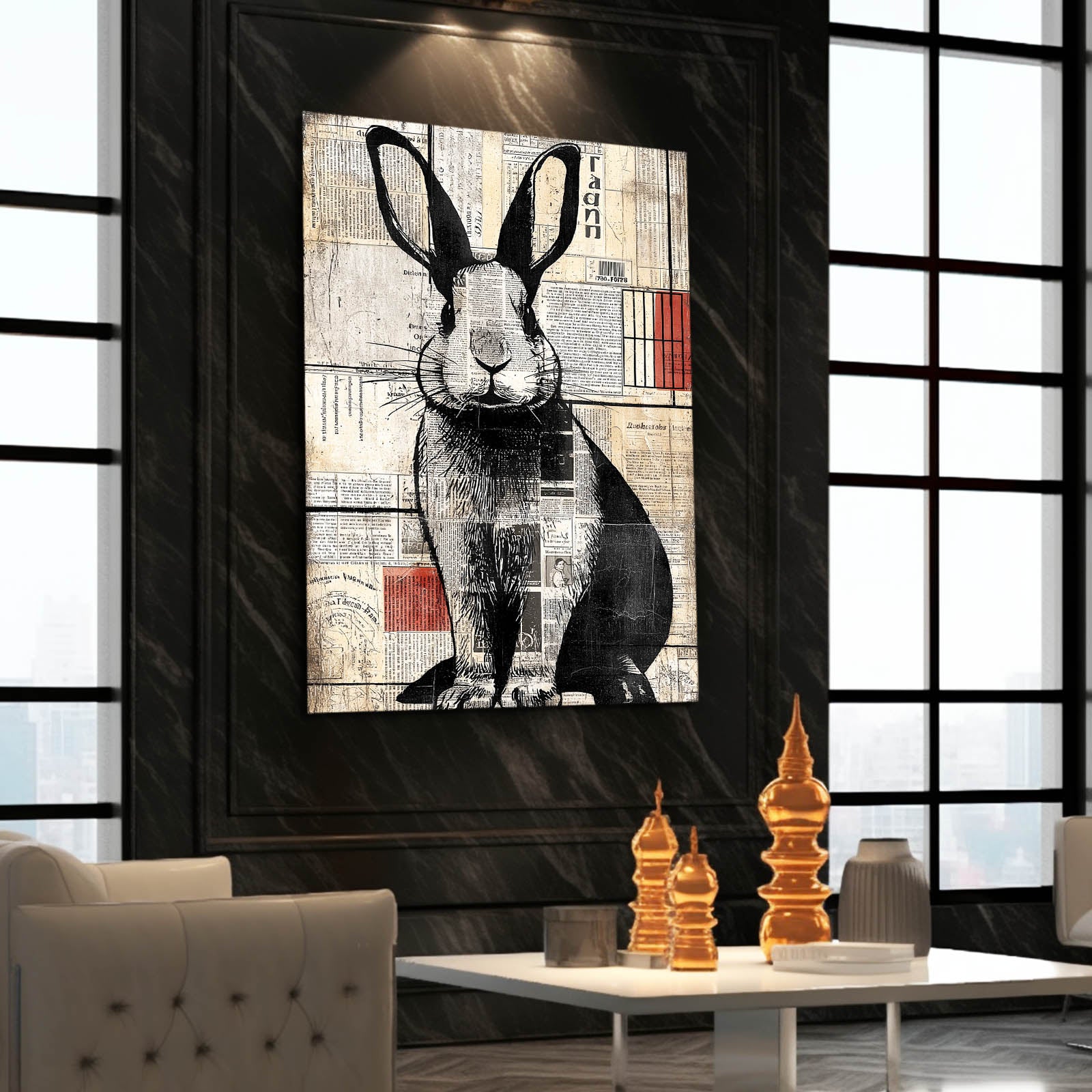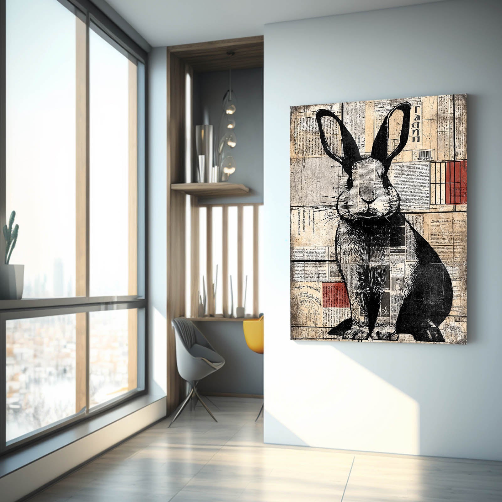 The combination of vintage newspaper elements, soft neutrals, and bold black linework creates a striking visual rhythm that feels both modern and nostalgic. Subtle touches of warm red accents and structured background shapes add depth, character, and visual intrigue. The rabbit’s confident posture enhances the piece with a sense of personality and quiet storytelling.