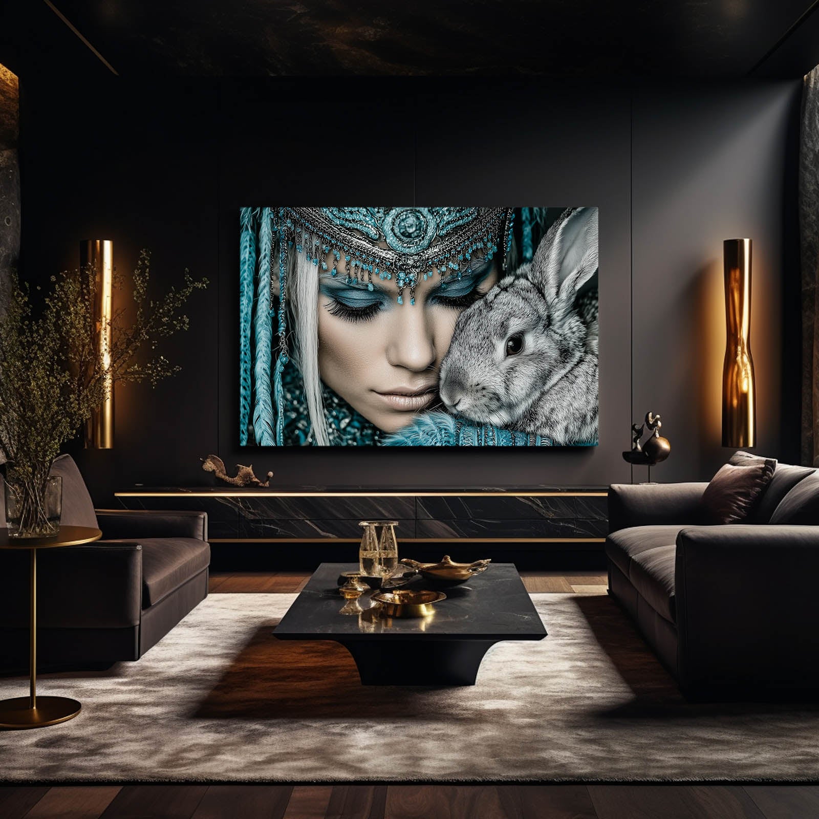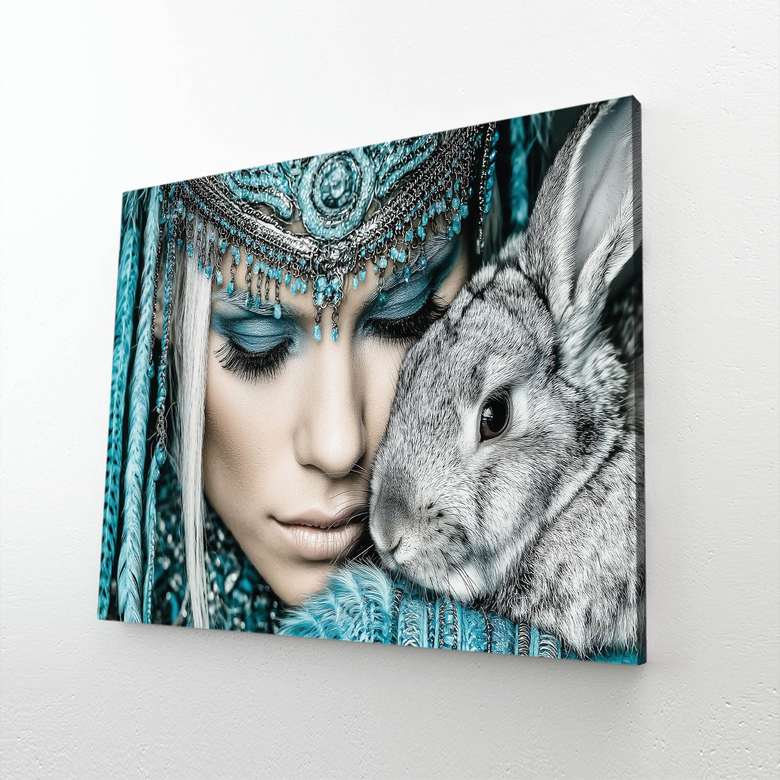 The close embrace between the woman and the rabbit radiates delicate warmth and expressive softness, blending human gentleness with the animal’s calm presence. Shimmering turquoise tones and intricate headpiece details add layers of visual richness and refined beauty, making the artwork feel both mystical and emotionally grounded.