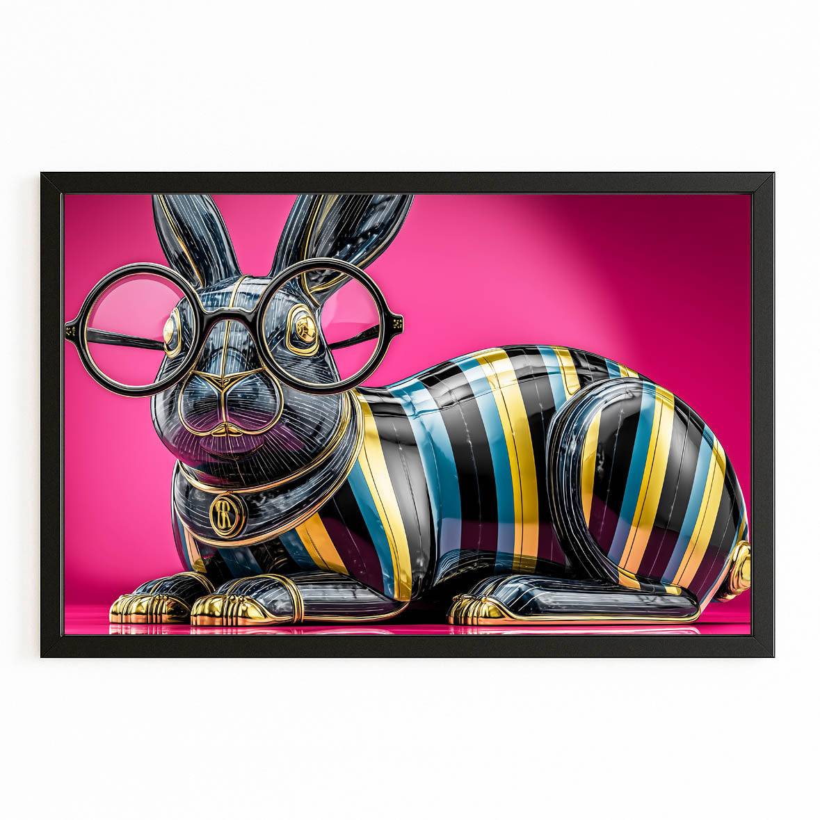 The glossy rabbit character, complete with oversized glasses and bold striped detailing, brings a sense of playful sophistication and irresistible whimsy. Its polished finish and striking palette of teal, yellow, black, and gold pop beautifully against the vivid pink background, enhancing the room with visual impact.