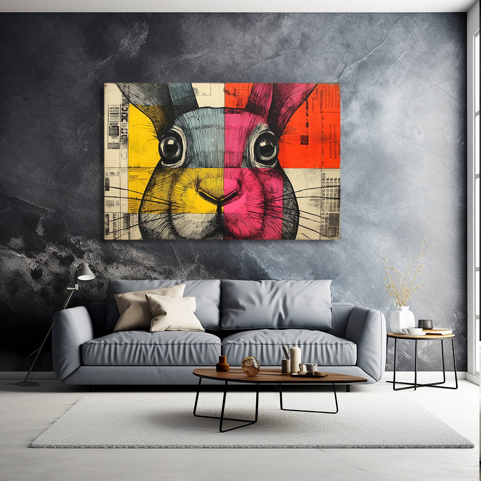 Fill your space with bold modern charm as the lively composition of Horizontal Bunny Print brings expressive color and captivating personality to your wall. The vibrant blocks of yellow, blue, pink, and orange introduce joyful contrast, while the rabbit’s wide eyes radiate playful curiosity. Its striking layout creates visual excitement that immediately brightens any room.