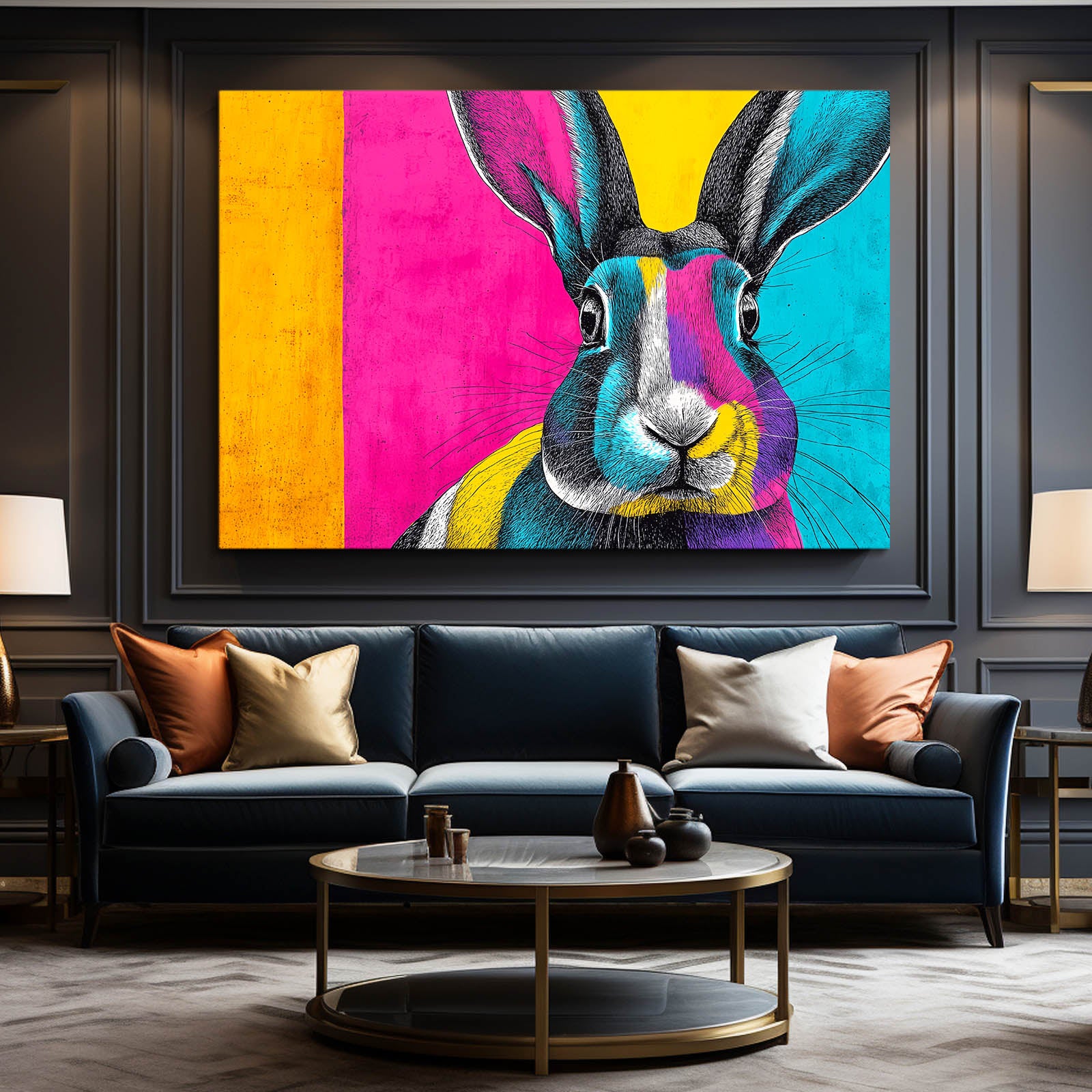 Bring an uplifting sense of joy into your space with this vibrant Living Room Bunny Print, created to instantly energize your décor. Its bold combination of bright colors, expressive details, and a charming rabbit character invites warmth and positivity into any room.