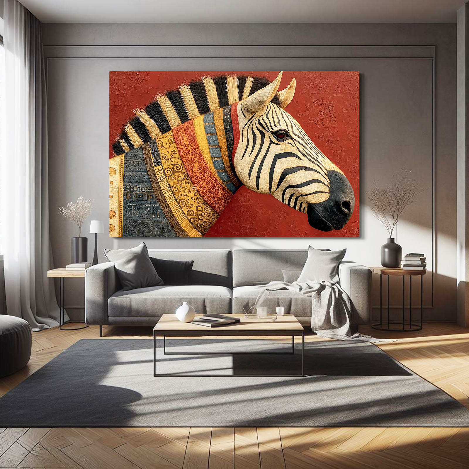 Red Zebra Art introduces a sense of strength and warmth that immediately draws the eye and anchors the room. The bold red background combined with refined zebra details creates a powerful visual rhythm that feels confident and intentional. This piece naturally stimulates focus, passion, and a sense of bold self-expression.